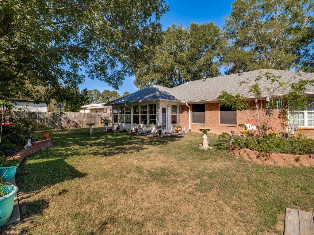 LOVE where you live! Perfectly sized, well-maintained, super functional, and extra cute home in the charming town of Quitman, TX! This single-story, 3-bedroom brick home checks the boxes with its desirable and efficient layout. Light and neutral tones throughout create a bright and versatile backdrop for any style. Enjoy a fresh kitchen with stainless steel appliances, ample cabinet storage, and generous counter space. The over quarter-acre Texas sized lot offers an amazing private backyard to relax, garden, entertain, and play. Wood fencing all the way around and here is even room on the side of the home for hidden boat or rv parking! Bonus spaces include a cozy, climate-controlled sunroom, a new and attractive storage shed tucked in the back, generous closet space throughout the home, and a two-car garage with an extra storage closet. This home is comfortable, clean, and affordable-it is ready for you!